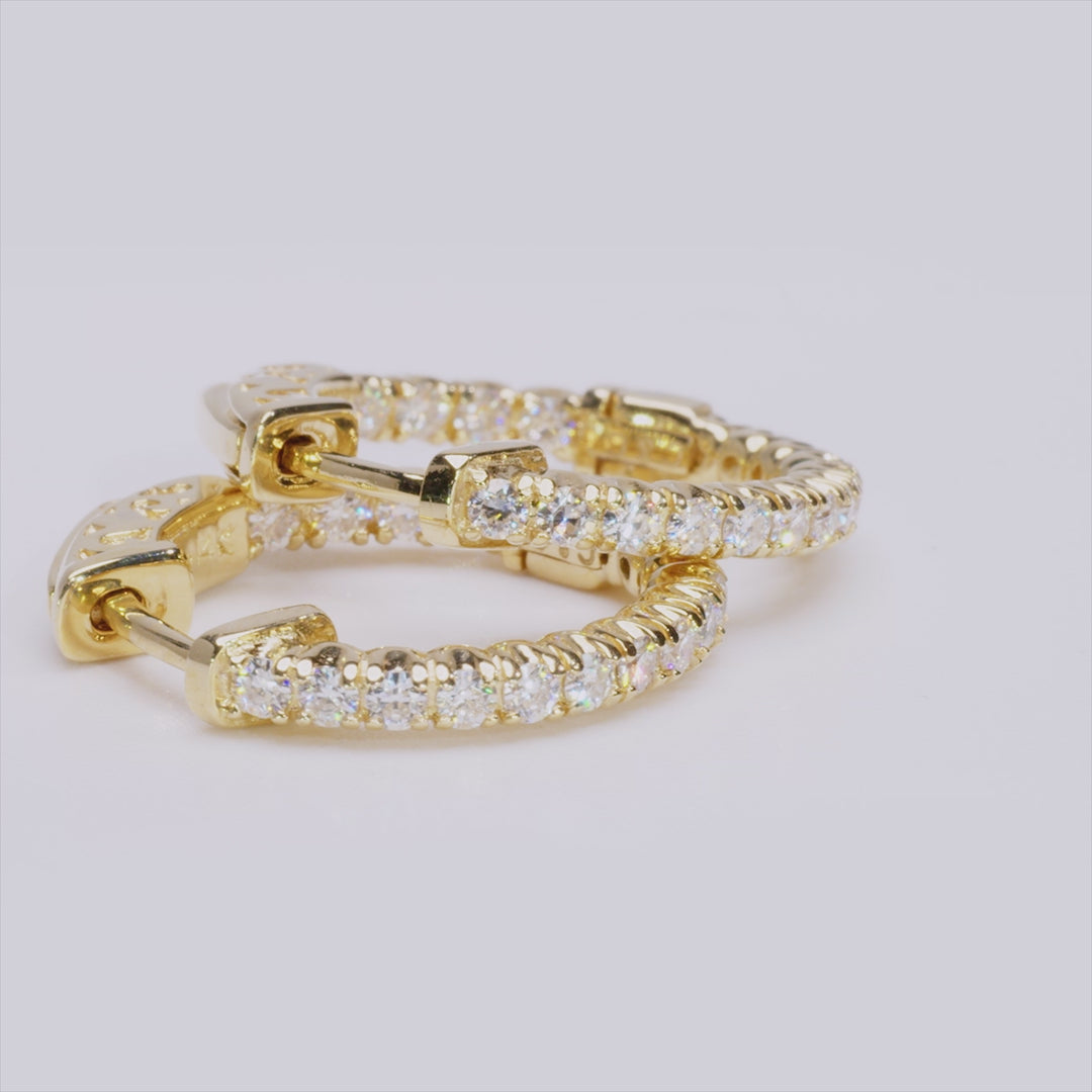 Sophisticated and stylish, these moissanite hoop earrings are a must-have accessory for your collection. Fashioned in 14K yellow gold, these dazzling earrings showcase a glittering array of 1.7mm stones that sparkle with every move you make. A fashionable addition to any outfit! Each hoop is 0.34 CTW DEW.
