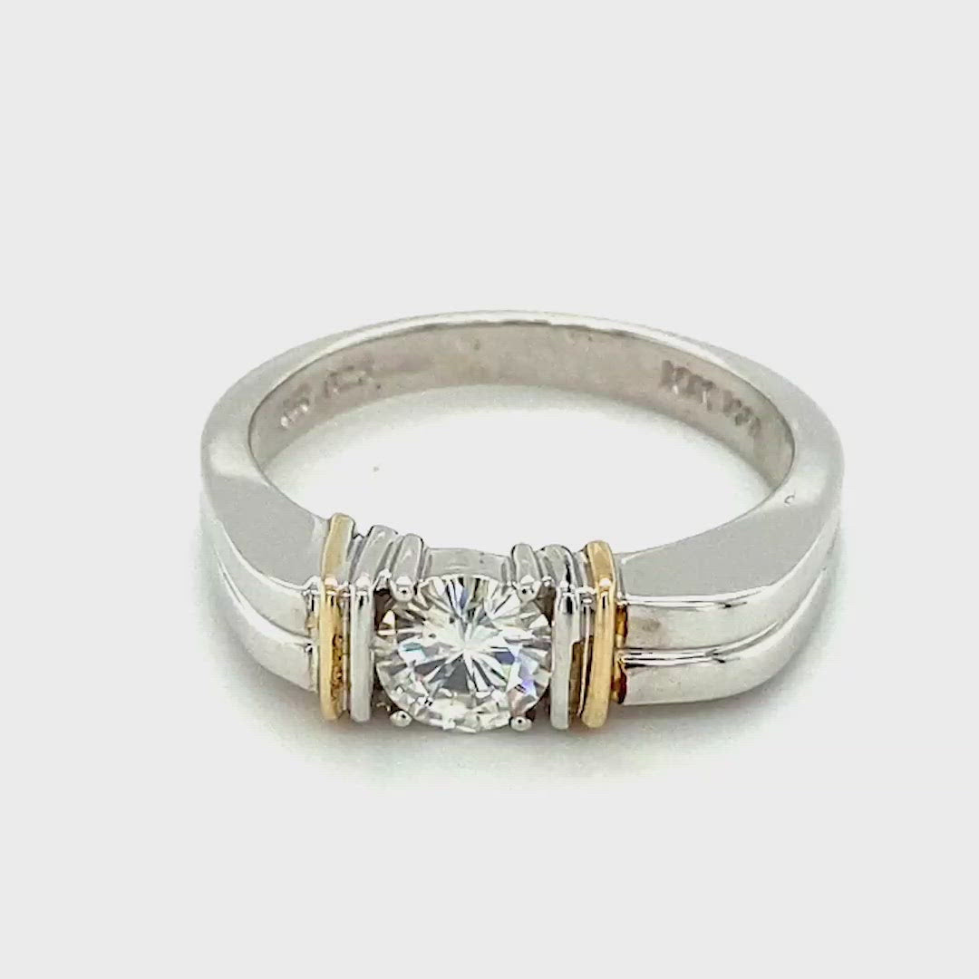 This beautiful band, set in sparkling two-tone silver, features a single round moissanite gemstone, at a diamond equivalent weight of 0.80 carats.