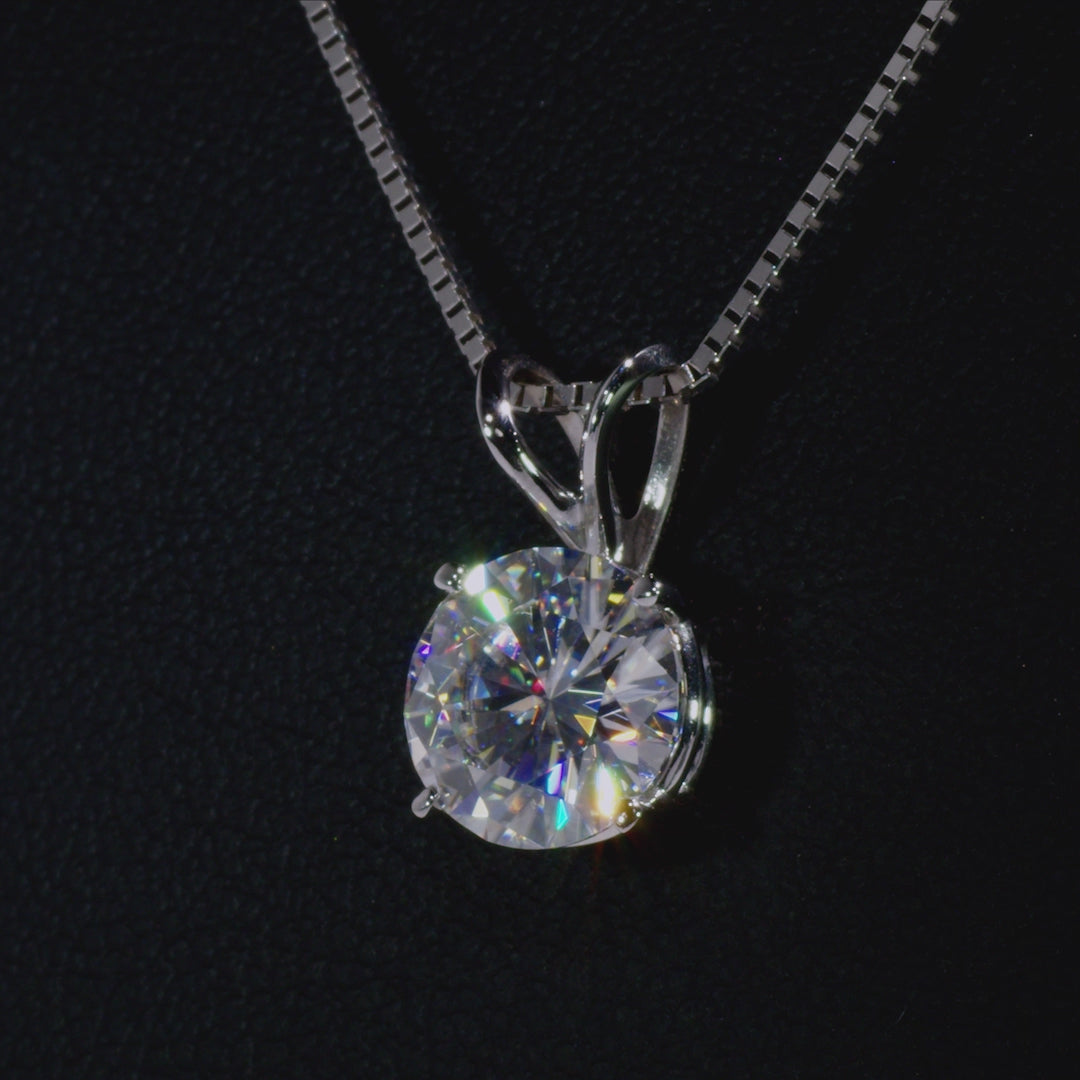 Add some sparkle to your evening out with this beautifully designed moissanite solitaire pendant. This pendant is 14K white gold and features a single 8.0mm round moissanite in a four prong setting with a split bail. The pendant comes with a box style 18” chain with a lobster claw clasp, and has a total diamond equivalent weight of 1.90ct.