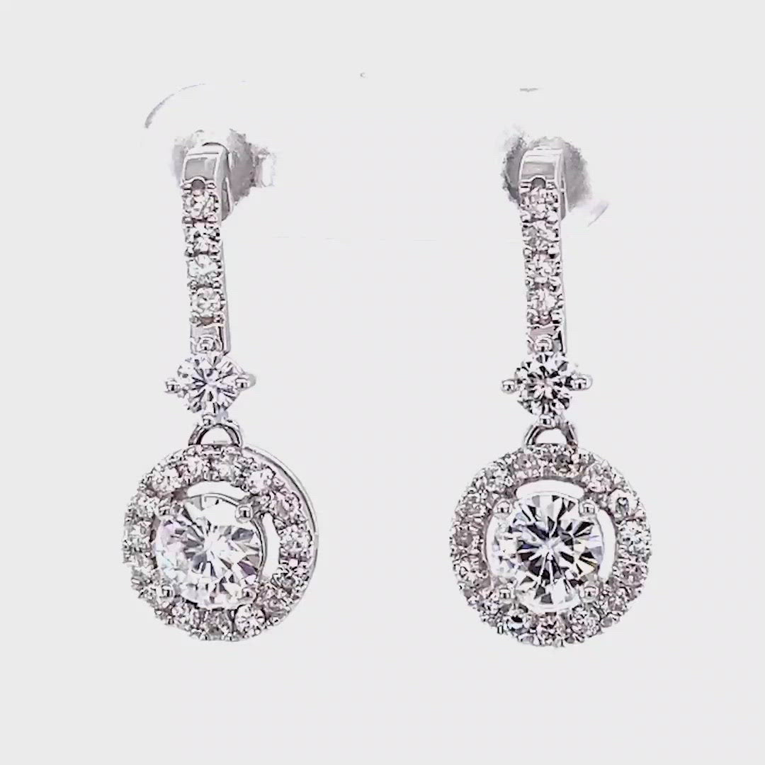 These striking drop earrings, set in shining 14k white gold, features round moissanite gemstones, totaling a diamond equivalent weight of 2.03 carats.